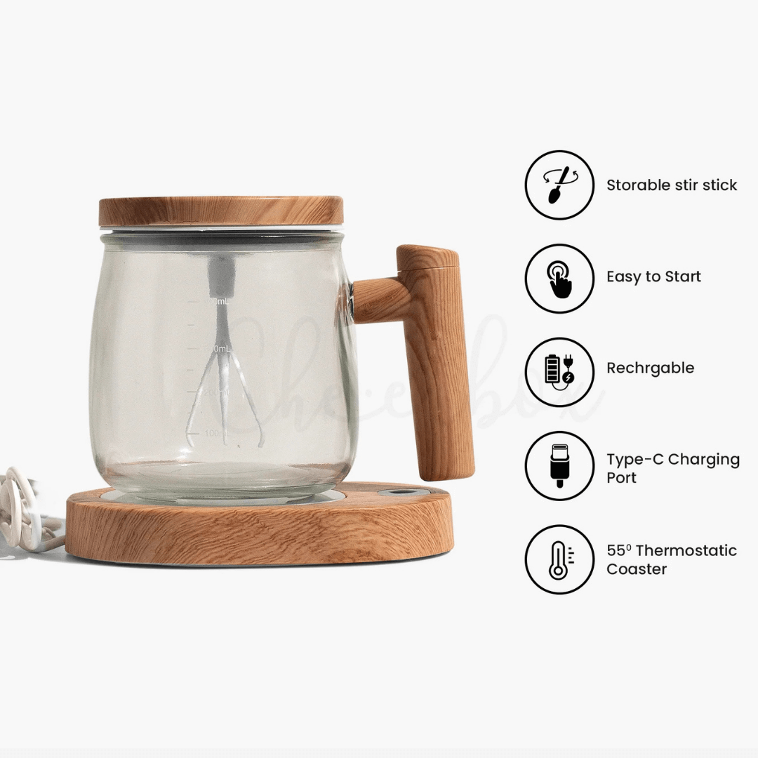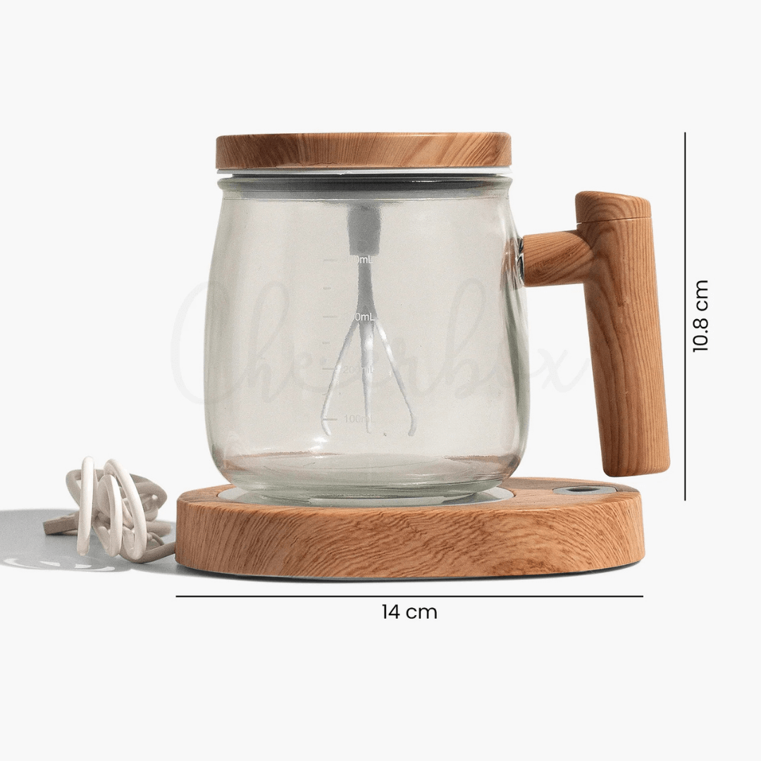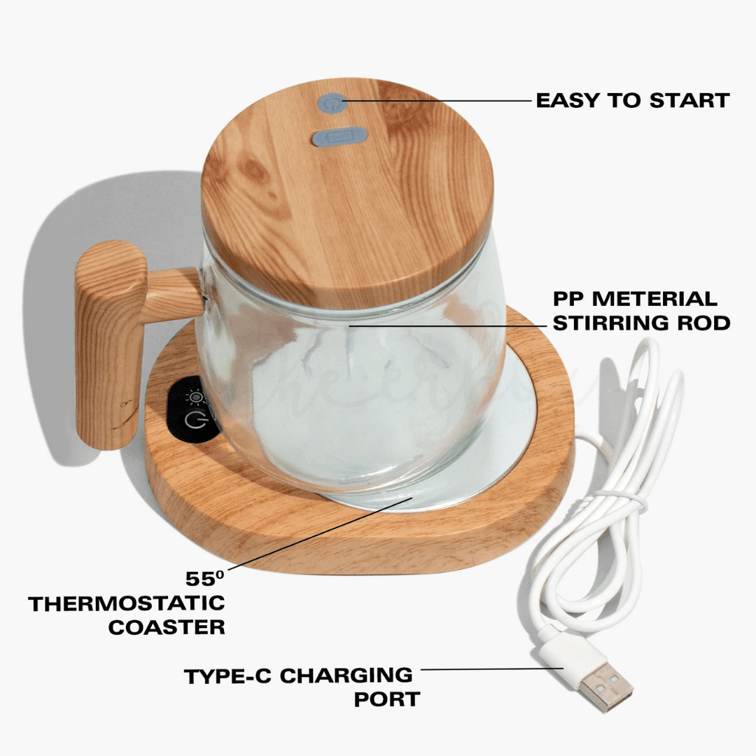 This premium Electric Self-Stirring Glass Mug is designed for coffee and tea lovers who want convenience, style, and consistent warmth in every sip. With a built-in stirring rod and a 55° thermostatic heating base, it keeps your drink mixed and warm without any effort. Premium natural wood housing, clear borosilicate glass container, intelligent electric motor with ergonomic grip, and thermostat heating tray.