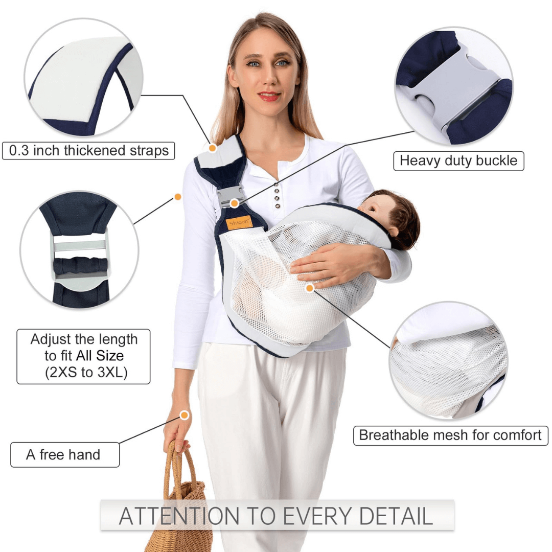 Engineered with 0.3-inch thick padded straps, a heavy-duty buckle, and breathable mesh fabric, it ensures superior comfort for both parent and baby. The adjustable design fits all body types (2XS to 3XL) and distributes weight evenly, preventing shoulder strain during long wear.
